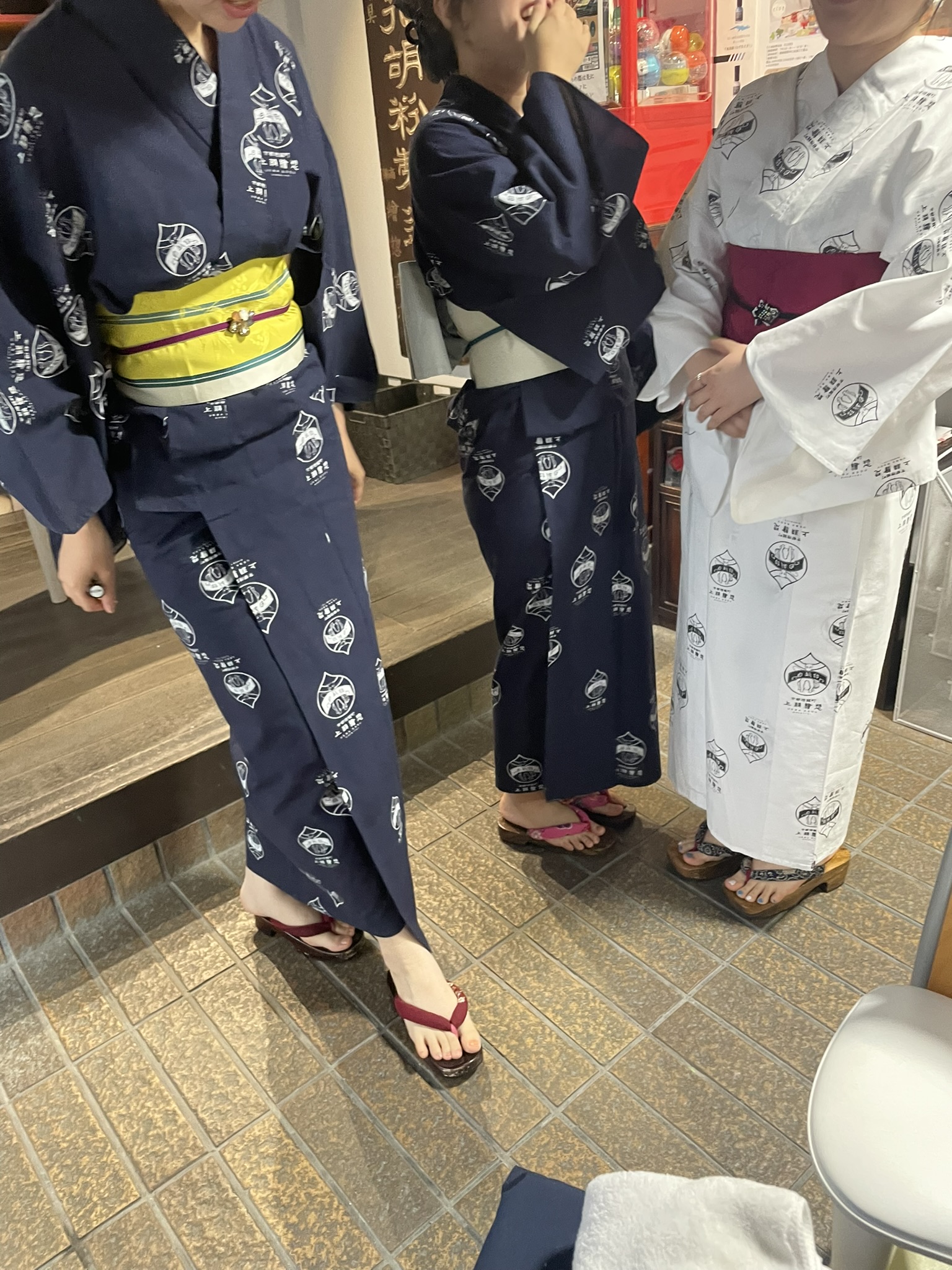 (写真は夏のイベントの際に、スタッフさんが上羽絵惣ロゴ入りを染めた浴衣で店頭に立たれている姿です。何とも素敵なんです。)