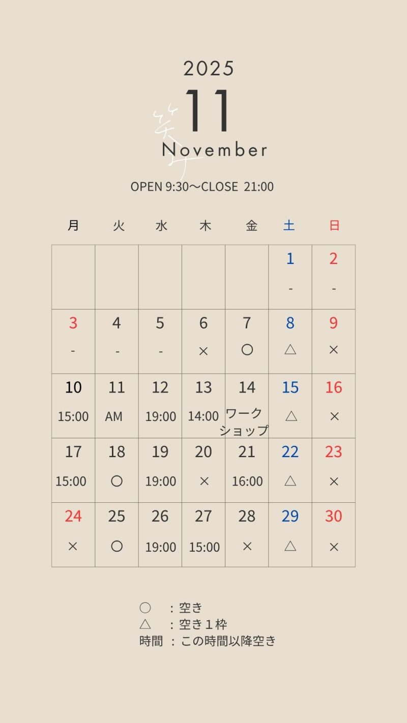ご予約案内 2025.11月 2025.11.5 お知らせ(ご予約・NEWS) 先日 京都大原に行きましたが、紅葉の盛りは一歩手前でした。 が、京都の街はいつも以上に観光客の方が増えるシーズン🍂 七五三の方もたくさんおられるので、日中のご予約可能な時間帯がどうしても少なくなっている11月です。 カレンダー内の時間は、その時間以降のスタートがご希望に添える という意味です。 〈 例:「15:00」=15時以降、19時までのスタート時間がご予約可能 〉 以下リンクからご予約くださいませ(*”▽”) 🍂HPご予約 🍂LINEご予約 投稿ナビゲーション Previous Page